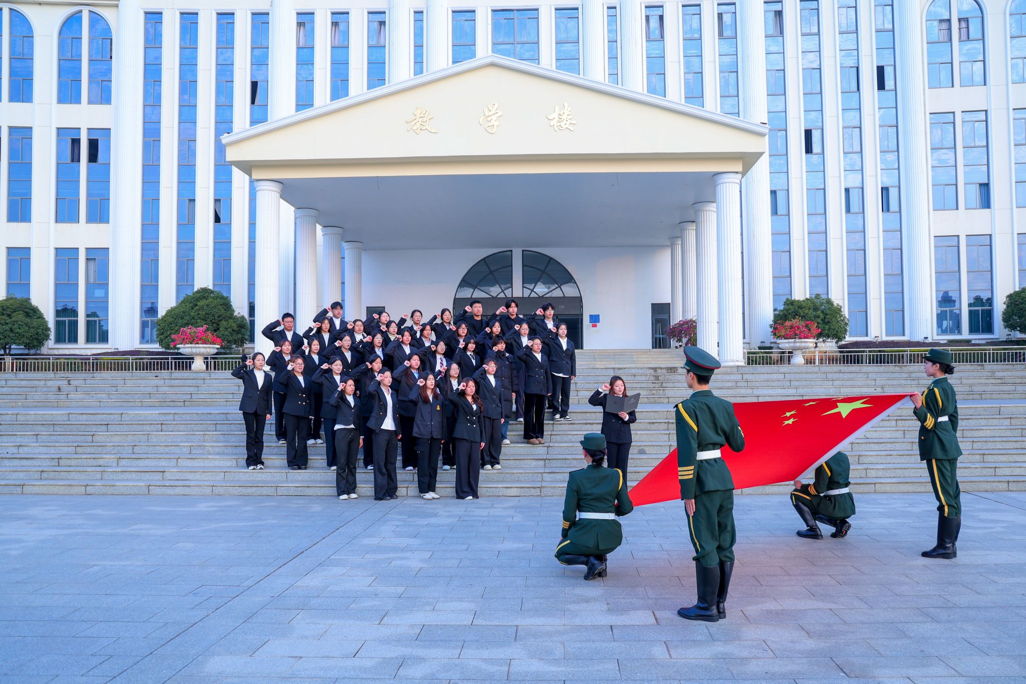 晨读结束后,现场举行了庄严的宪法宣誓仪式。四名校国旗护卫队的学生手持国旗,肃立于前。全体参与人员在社长何一诺的领誓下,面向国旗,高举右拳,郑重宣誓:“我保证,永远忠于中国共产党,忠于祖国,忠于人民……遵守宪法和法律,践行社会主义核心价值观……为中华民族伟大复兴努力奋斗!”誓言铮铮,表达了江服学子忠于宪法、忠于祖国、忠于人民的坚定信念,以及刻苦学习、报效社会的青春担当。