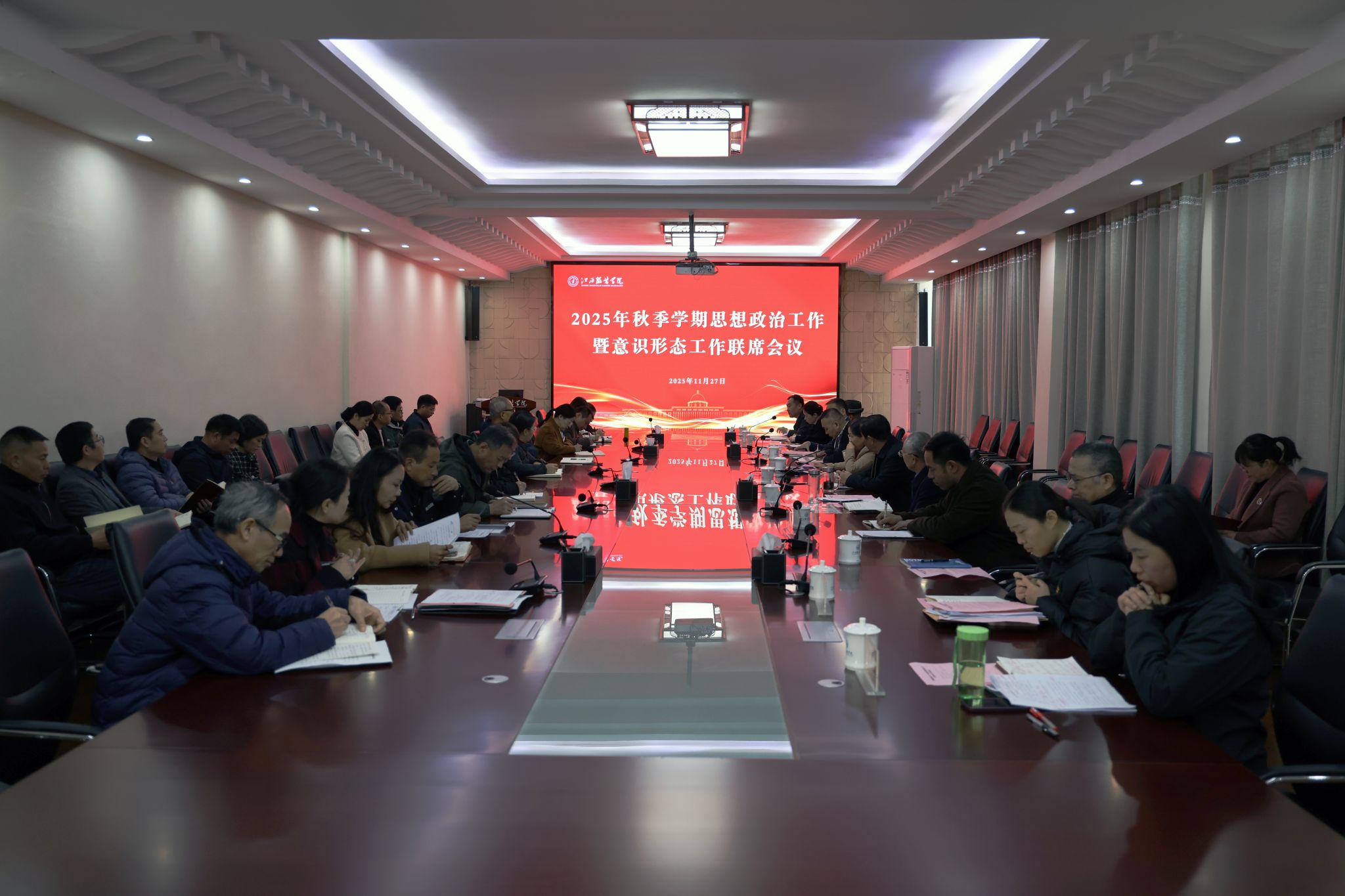 新闻中心讯(文/龙瑞行 图/万强、徐志勇)11月27日,我校在行政楼二楼会议室召开2025年秋季学期思想政治工作暨意识形态工作联席会议。校党委书记林井萍主持会议并讲话,校长薛家宝出席会议,校党委委员,在家校领导,各部门负责人,各学院(部)党政负责人参加会议。