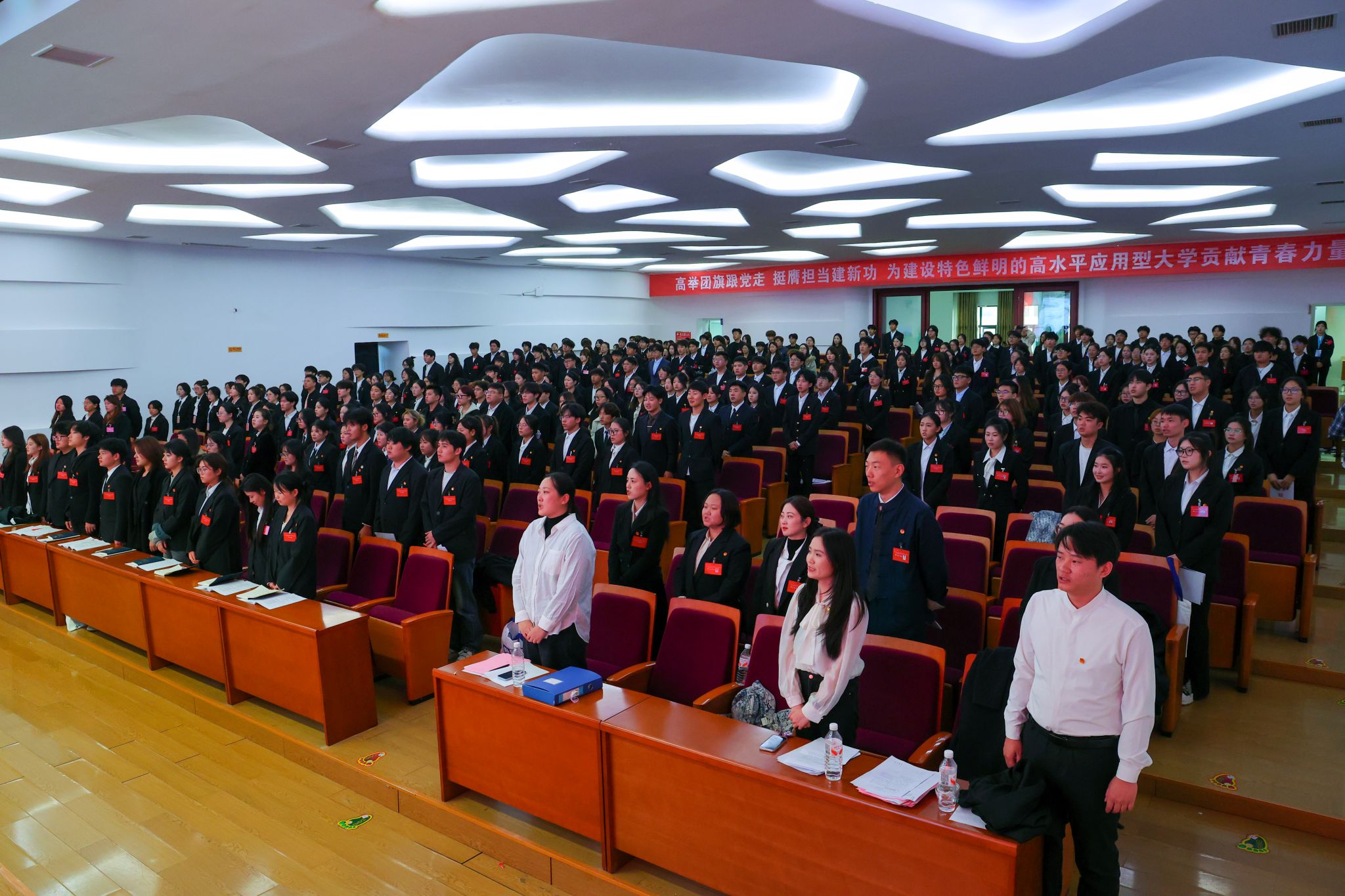 大会在雄壮的国歌声中正式开幕。全体与会人员肃立致敬,激昂的旋律在会场回荡,凝聚起江服青年听党话、跟党走的坚定信念,也为这场青春盛会奠定了庄严奋进的基调。