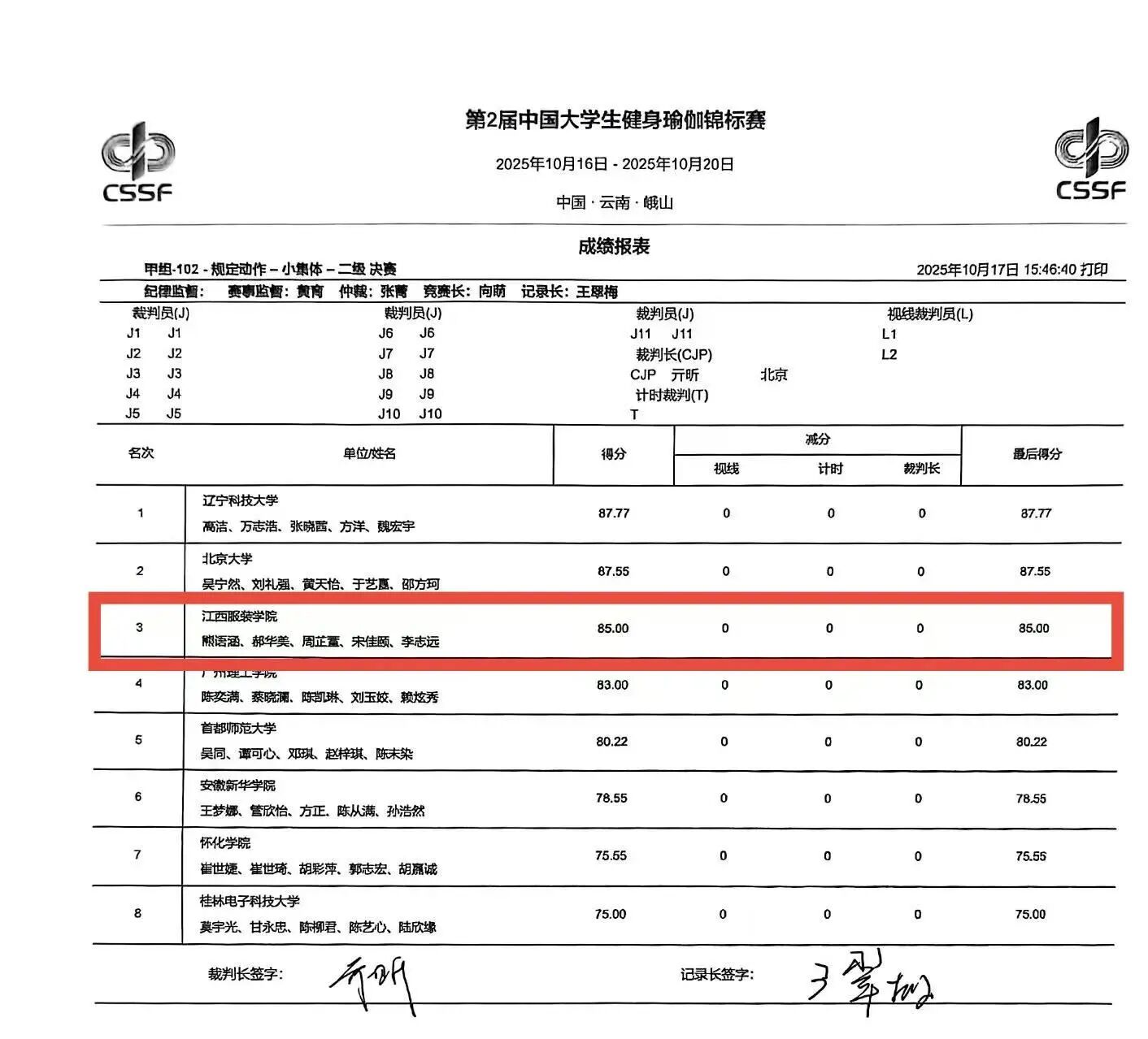 新闻中心讯(供稿/军事体育教学部)金秋送爽,捷报频传。10月15日至20日,由中国学生体育联合会主办的2025年中国大学生健身瑜伽锦标赛在云南峨山举行。我校瑜伽代表队奋勇拼搏、表现卓越,最终斩获本科甲组二级女双冠军、混双亚军、小集体季军的优异成绩,为学校赢得荣誉,充分展现了江服学子昂扬向上的精神风貌。