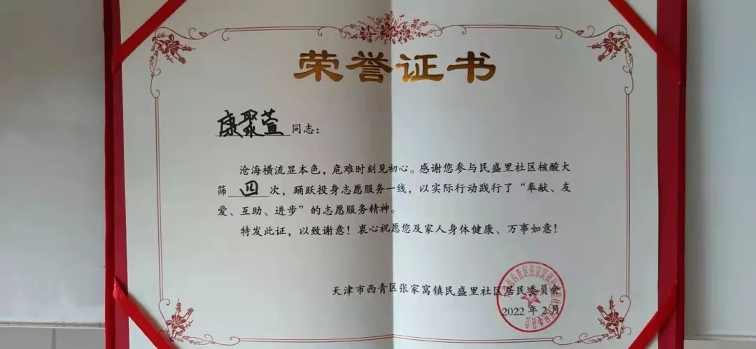 21服工专科1班的康聚萱可谓是“沧海横流显本色,危难时刻见初心”。在疫情暴发期间,她4次投身志愿服务一线,参与民盛里社区核酸检测工作,她用行动证明了新时代的中国青年是好样的。