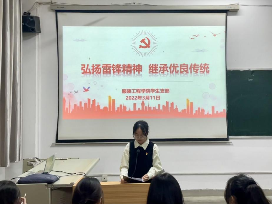 服装工程学院讯(撰稿:揭琼星)为了大力弘扬雷锋精神,继承优良传统,3月11日晚上7:00时,服装工程学院学生党支部在主教楼128多媒体教室组织开展了“弘扬雷锋精神,继承优良传统”主题党日活动,学院部分党员和入党积极分子参加了主题党日活动,活动由陈思思主持。