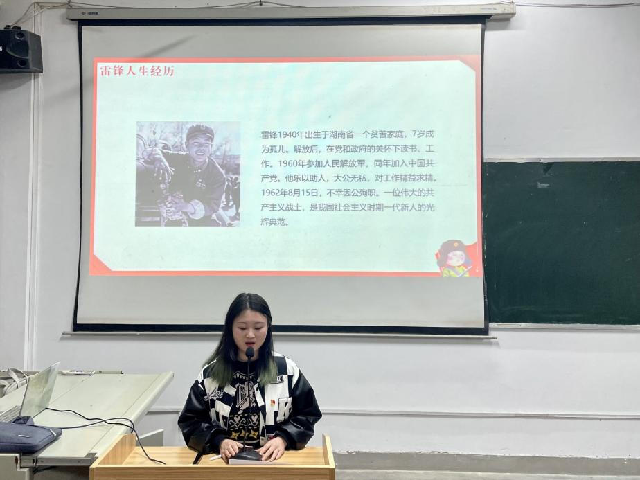 接下来,服装工程学院大学生党史宣讲团成员李梦瑶以《传承雷锋精神,不负时代重托》为主题进行宣讲。她向在场的同学们讲述了雷锋的一生,指出雷锋对后世影响最大的是以其名字命名的雷锋精神。雷锋精神是为共产主义而奋斗的无私奉献的精神,是忠于党和人民、舍己为公、大公无私的奉献精神,归根结底就是全心全意为人民服务的精神。