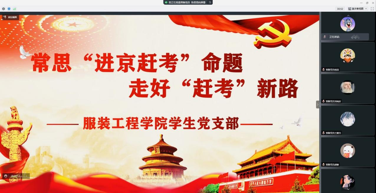 3月29日晚上18:00时,服装工程学院通过腾讯会议的方式开展了“常思‘进京赶考’,走好‘赶考’新路”为主题的党日活动。学院学生党支部书记洪婷、专职组织员蔡燕萍、全体辅导员及部分学生党员参加了主题党日活动,活动由陈思思主持。