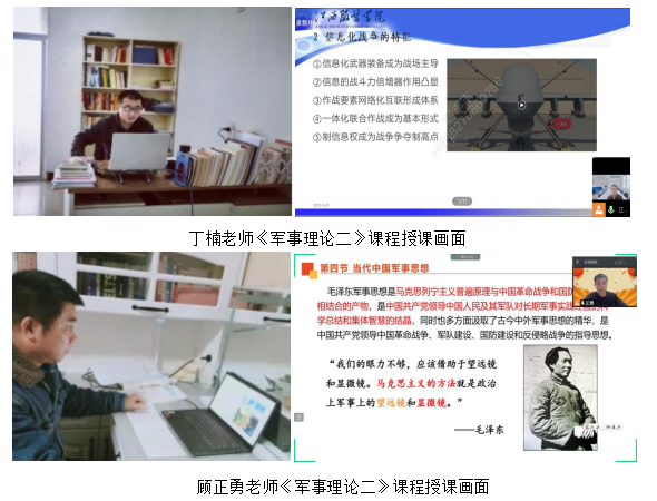 疫情当前,为保障学生疫情防控期间身心健康,增强学生体质,体育教研室副主任王福滨带领全体体育教师积极行动,认真落实,结合居家体育锻炼特点,精心设计线上体育教学内容,做好师生锻炼的领操员,为学生带来了精彩生动的线上体育课堂。军事理论教研室副主任丁楠和教师们闻令而动,深入落实立德树人根本任务,不断丰富课程内容,把爱国主义教育和军事国防教育有机结合,努力引导广大学子涵养爱国之情、砥砺强国之志、实践报国之行。