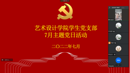 为深入学习贯彻习近平总书记重要讲话精神,进一步发挥基层党组织的战斗堡垒作用和共产党员的先锋模范作用,庆祝建党101周年,喜迎党的二十大,2022年7月5日下午15:30时,艺术设计学院学生党支部于线上开展“庆祝建党101周年,喜迎党的二十大”主题党日活动,学生党支部全体党员参加了此次会议,会议由学生党支部书记蔡子威主持。
