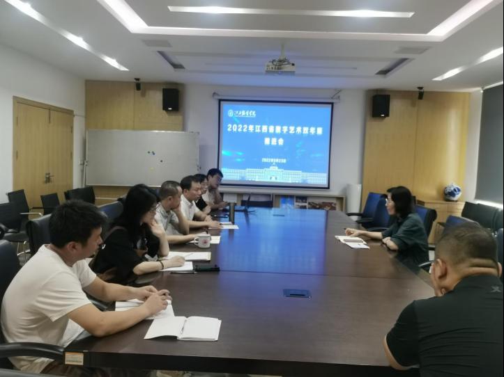 (时尚传媒学院讯揭倩茹撰稿)9月22日下午1时30分,时尚传媒学院组织召开2022年江西省数字艺术双年展推进调度会,时尚传媒学院院长甘文、副院长李有为、院长助理阳石刚、动画教研室主任李荣发、广播电视编导教研室副主任潘刚健、教师揭倩茹及相关工作人员参会,会议由时尚传媒学院院长甘文主持。