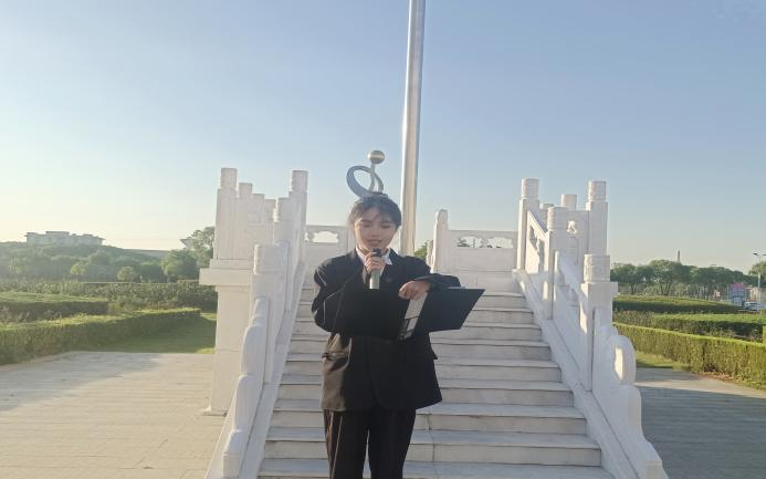 升旗仪式第二项。人文学院学生代表21级广告本科3班张宇杰发言,她说到:广大青年要点亮信仰明灯,扛起时代责任,志存高远、脚踏实地,勇做时代的弄潮儿,在实现中国梦的生动实践中放飞青春梦想,在为人民利益的不懈奋斗中书写人生华章。