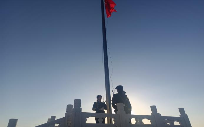 七时整,国旗护卫队的旗手们迎着朝阳,以饱满的热情,踏着矫健的步伐护卫着国旗向大家走来。之后,伴着铿锵有力的《义勇军进行曲》,在同学们崇敬的目光下,鲜艳的五星红旗冉冉升起。