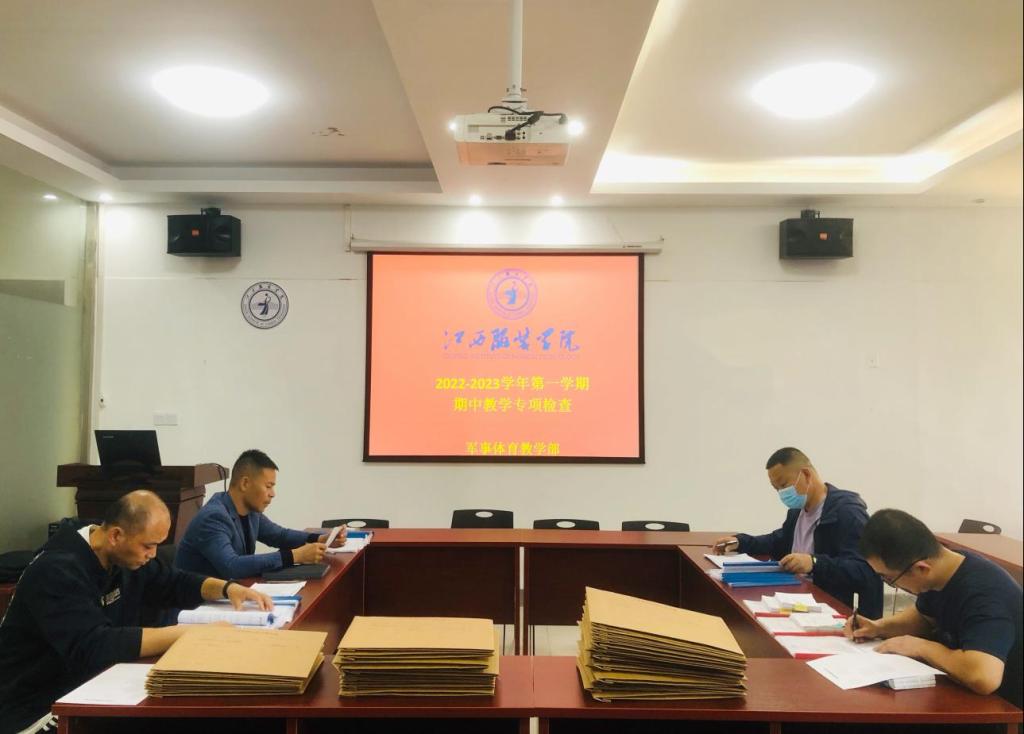 【军体部讯】为全面掌握本学期开学以来教学运行情况,切实提高教学管理水平与教学质量,根据《关于2022-2023学年第一学期期中教学检查的通知》(江服教发﹝2022﹞127号)文件精神,11月7日,军事体育教学部组织开展2022-2023学年第一学期期中教学专项检查。军事体育教学部主任胡伟、副主任褚欢同部门日常教学检查成员组成专项检查组,对任课教师教学材料进行全面检查。