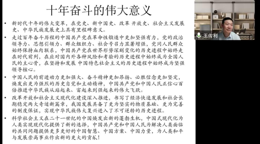 王传利教授深刻把握党的二十大的重大意义,对党的二十大精神进行了全面系统深入解读。党的二十大报告系统阐述了新时代坚持和发展中国特色社会主义的重大理论和实践问题,科学谋划未来5年乃至更长时期党和国家事业发展的目标任务和大政方针,提出一系列新的思路、新的战略、新的举措,发出了为全面建设社会主义现代化国家、全面推进中华民族伟大复兴而团结奋斗的动员令。全面深入领会党的二十大精神,准确把握报告的丰富内涵至关重要。