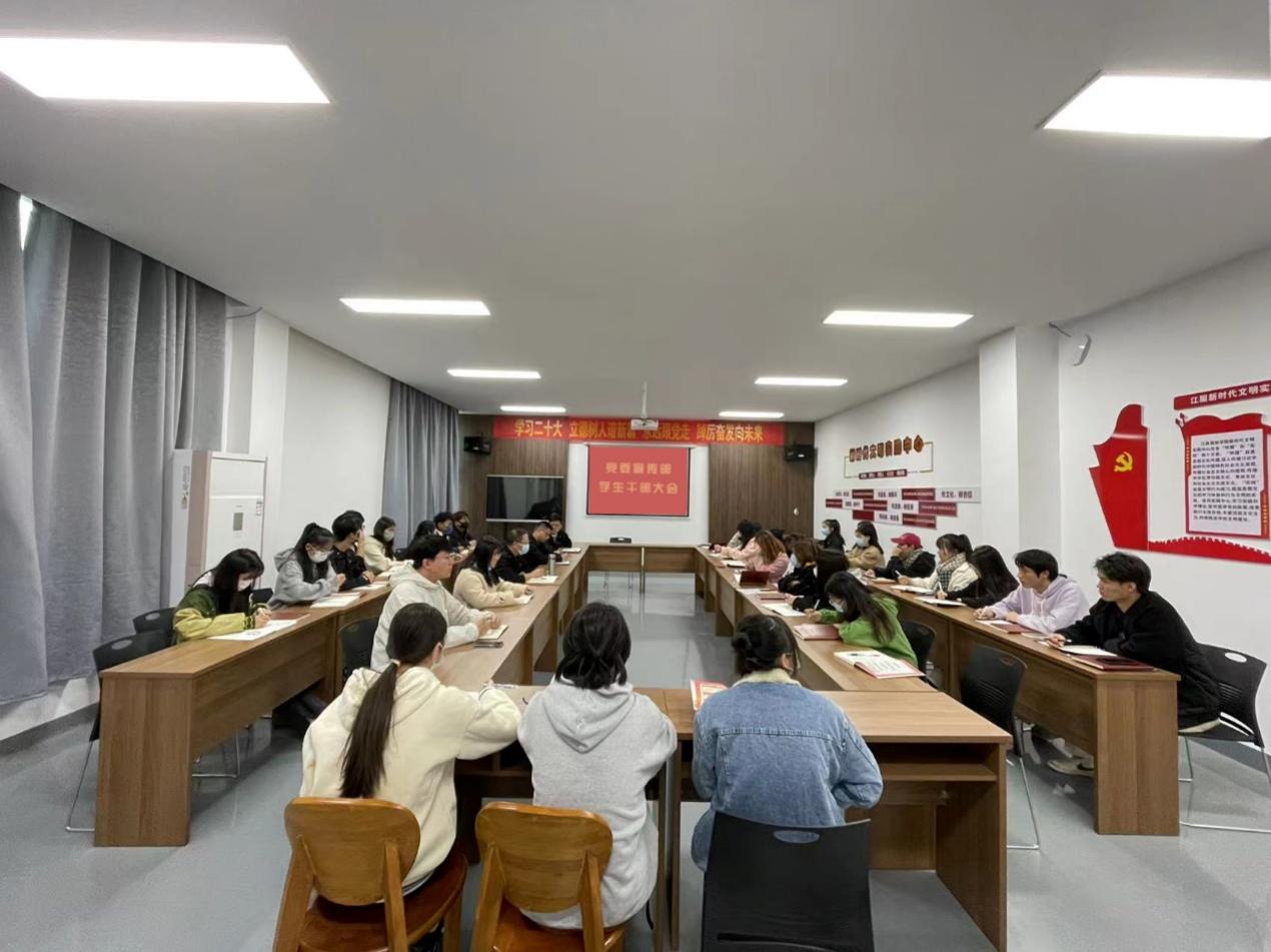 新闻中心讯(记者/金温南 摄影/黄珊)为深入学习贯彻习近平新时代中国特色社会主义思想和党的二十大精神,更好做好学校宣传思想工作,持续巩固和深化江西服装学院大学生记者团学生干部的政治教育成果。11月29日下午,我校党委宣传部学生干部大会在宣传部二楼宣讲室召开,党委宣传部副部长朱雨春、宣传教育科科长万强、指导老师龙瑞行、徐志勇、陈蕾出席会议,服装报社、江服广播电视台、融媒体中心、新媒体联盟部长级以上学生干部参加了会议。会议由党委宣传部副部长朱雨春主持。
