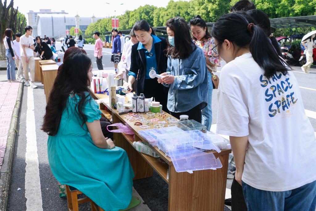 阳春四月,惠风和畅。集市内摆放的各种摊位琳琅满目,引来不少同学驻足观看购买,形成了校园里一道亮丽的风景线。自己做的手工艺品、个人书籍、学习用品、电子产品、生活用品及体育用品等。街上买卖声、吆喝声,讨价还价声......连成一片。