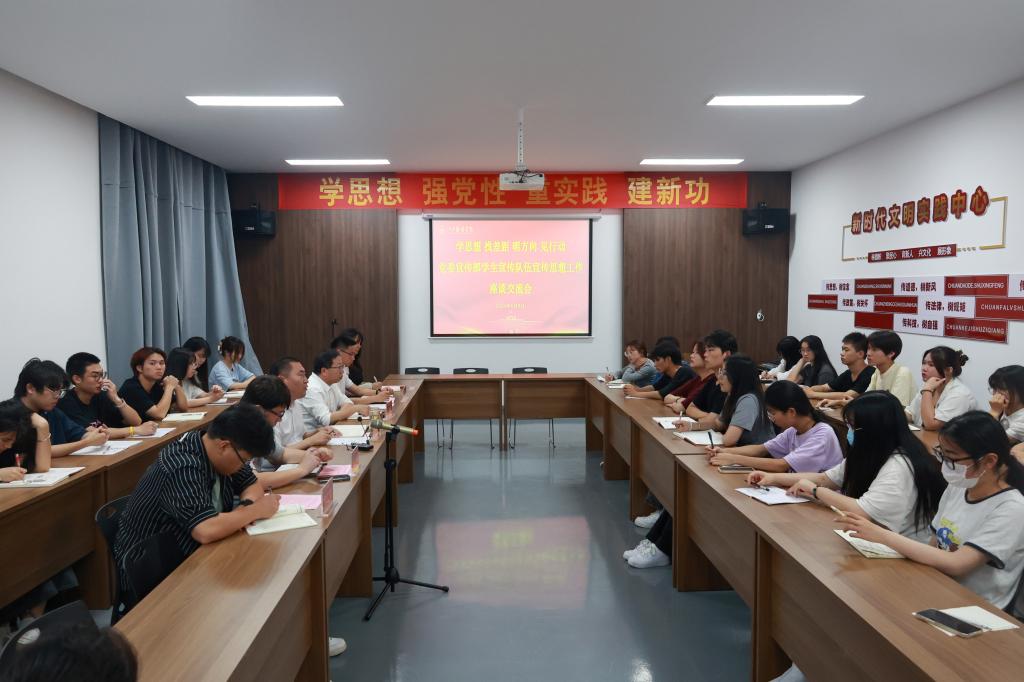 新闻中心讯(记者/金温南 邬章越 实习记者/李佳琦 涂旭欢 摄影/黄珊)为深入学习贯彻习近平新时代中国特色社会主义思想,学习贯彻习近平总书记关于宣传思想工作的重要论述,进一步加强学校宣传思想文化工作队伍建设,扎实推动主题教育走深走实。6月8日晚,党委宣传部在新时代文明实践中心召开学生宣传队伍宣传思想工作座谈交流会。校党委委员、党委宣传部部长沈新建,党委宣传部副部长朱雨春,指导老师龙瑞行、徐志勇、樊翔出席会议,服装报社、江服广播电视台、融媒体中心、新媒体联盟等学生骨干参加会议。会议由宣传教育科科长万强主持。