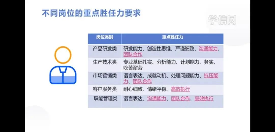 田振敏老师以华为招聘为例,解析如何在求职中快速匹配岗位,读懂招聘单位的需求。每一个岗位招聘对求职者的要求,基本包括了知识、技能、角色定位、自我认知、特质和动机等几个方面。从多个不同的岗位重点胜任力要求不难看出,沟通能力、团队合作和高效执行是高频出现词汇。