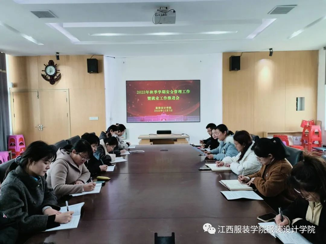 为深入贯彻学习教育部印发《关于做好2024届全国普通高校毕业生就业创业工作的通知》促进2024届毕业生就业创业,2023年12月7日下午,服装设计学院于清源一栋四楼学院会议室召开了2023年秋季学期学生管理工作暨就业工作推进会。出席本次会议的有党委书记蓝岚、党委副书记周洪英、学工办主任张敬玲、全体辅导员、班主任参加会议。