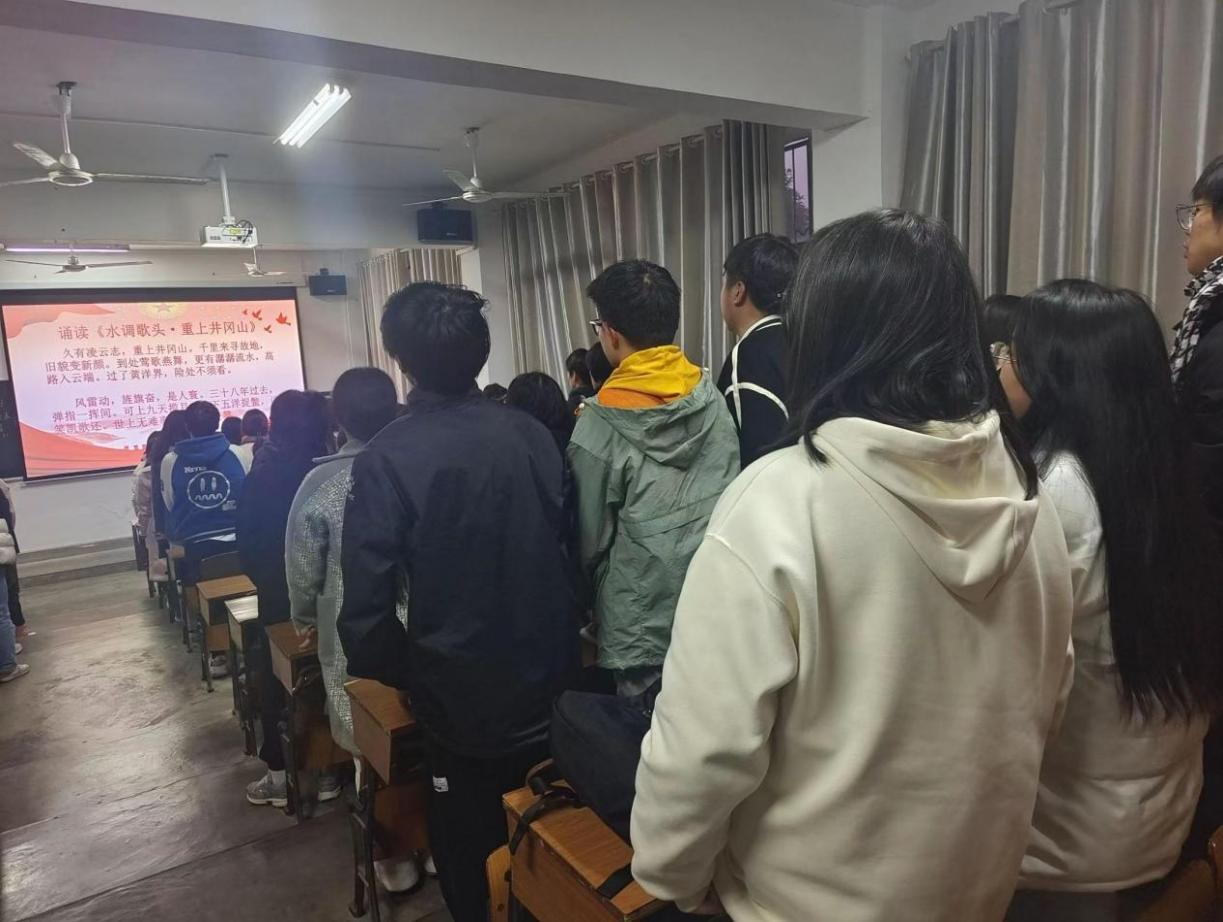 活动第一项,培训班全体学员共同观看了毛泽东同志《水调歌头·重上井冈山》的诵读视频。随后,两名同学自告奋勇朗诵了毛泽东同志的诗词,他们朗诵时坚定的眼神和自如的气质,带着在场的师生一起回到了过去。