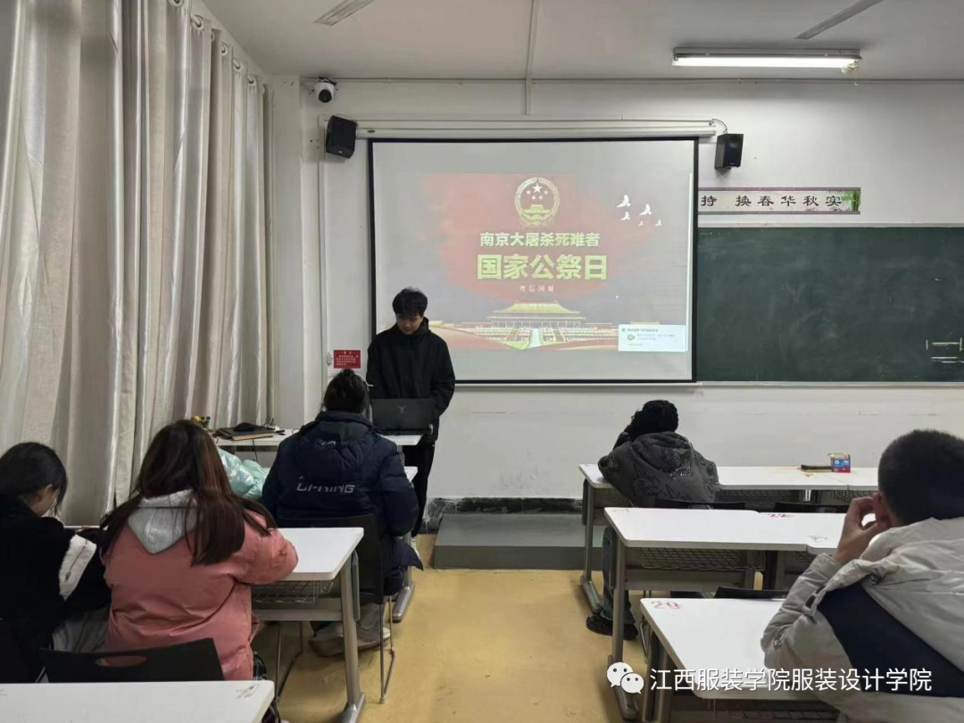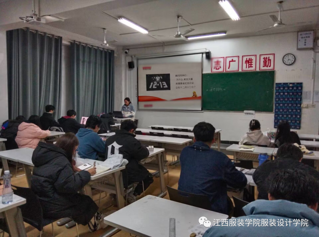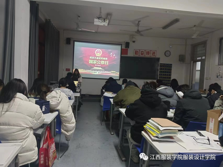 2023年12月13日,是我国第十个国家公祭日。为了悼念南京大屠杀遇难同胞,缅怀革命先烈,教育引导学生铭记历史。服装设计学院各班级于教室开展“缅怀先烈,勿忘国殇”国家公祭日主题教育活动。