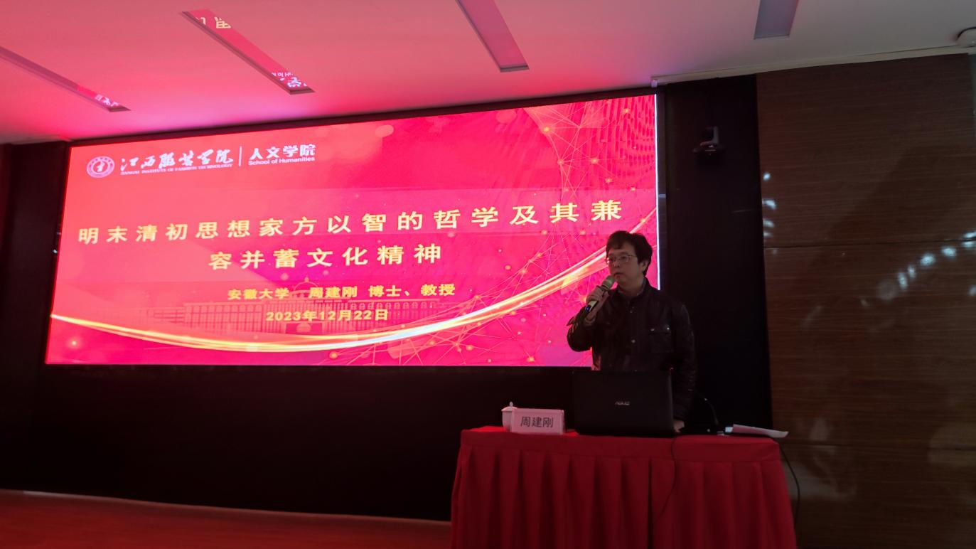 人文学院讯(陈家华撰稿)为进一步提升我院学生的人文素养,12月22日晚7点在行政楼一楼报告厅,人文学院特邀安徽大学周建刚教授作题为“明末清初思想家方以智的哲学及其兼容并蓄文化精神”的学术讲座。校长助理马国照、人文学院副院长陈家华、人文学院语言文化教研室教师杨博、潘泽中参加了讲座。参加讲座的学生有孔子学苑及人文学院学生代表共计170余人。讲座由副院长陈家华主持。