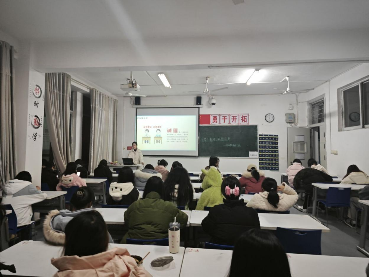 22级各班从诚信应考与安全离校两个方面展开。班会主持人提示同学们,期末考试要来临,要调整心态认真复习,严肃考试纪律、诚信应考;离校前,宿舍成员要做好宿舍各类安全隐患的排查,在返程途中注意交通安全;同时要远离不良网贷和电信网络诈骗,做到合理消费;近期,呼吸道疾病高发,同学们要做好健康防护, 增强自我健康管理能力。