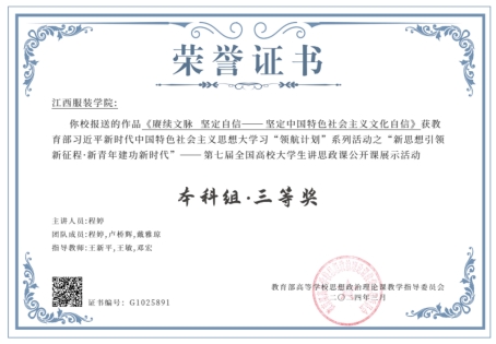 马克思主义学院讯近日,教育部公布了第七届全国高校大学生讲思政课公开课展示活动获奖名单。由江西服装学院马克思主义学院思政课教师王新平、王敏、邓宏指导学生程婷、卢桥辉、戴雅琼主讲的《赓续文脉坚定自信——坚定中国特色社会主义文化自信》,从全国4402份作品中脱颖而出,喜获教育部习近平新时代中国特色社会主义思想大学习“领航计划”系列活动之“新思想引领新征程·新青年建功新时代”——第七届全国高校大学生讲思政课公开课展示活动本科组三等奖。