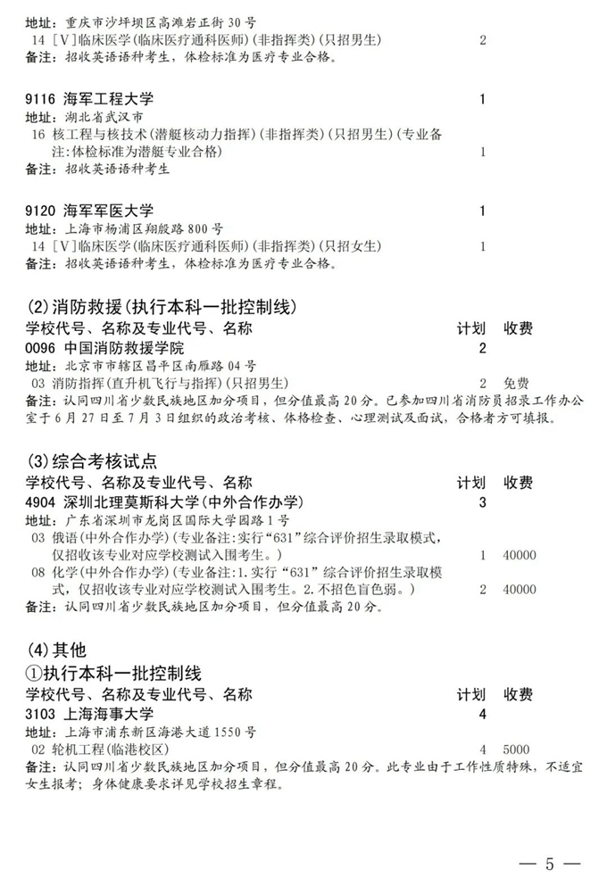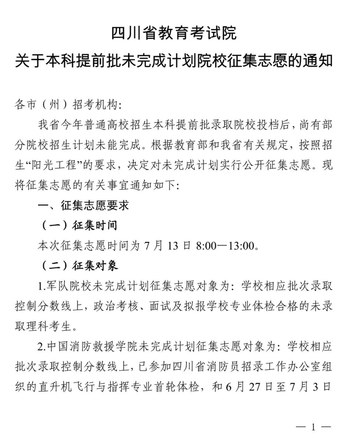 四川:关于本科提前批未完成计划院校征集志愿的通知