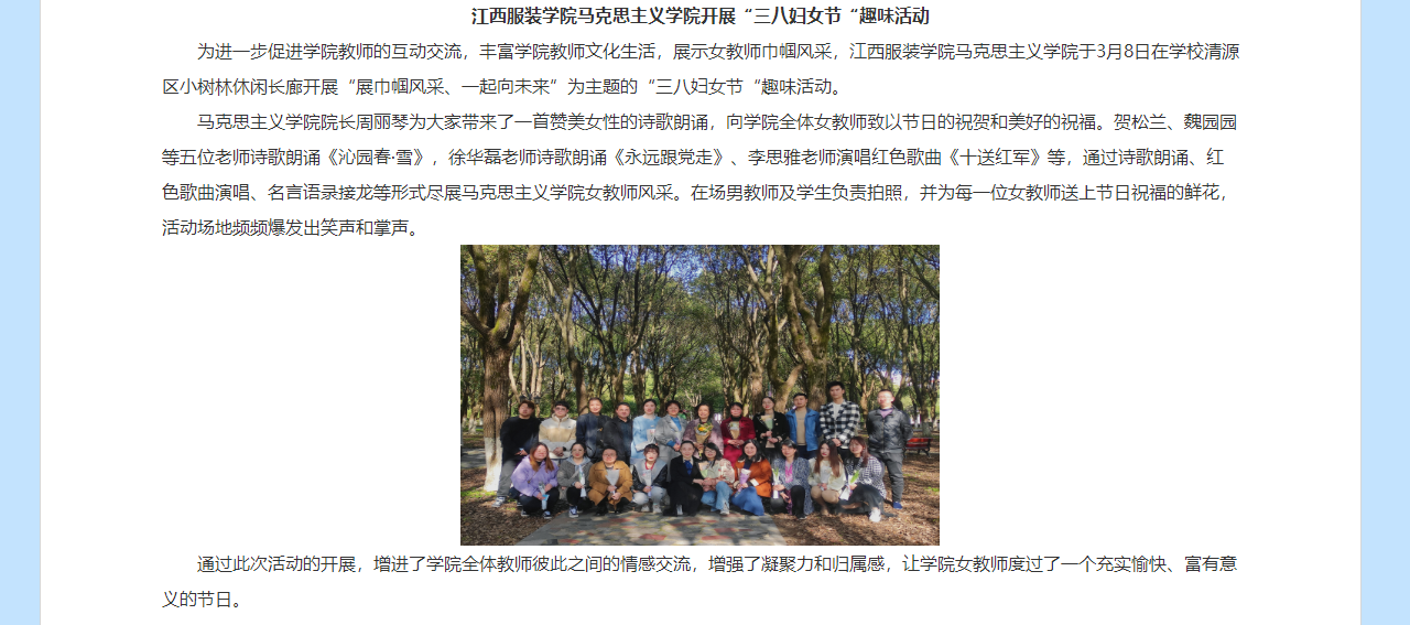 为进一步促进学院教师的互动交流,丰富学院教师文化生活,展示女教师巾帼风采,江西服装学院马克思主义学院于3月8日在学校清源区小树林休闲长廊开展“展巾帼风采、一起向未来”为主题的“三八妇女节“趣味活动。