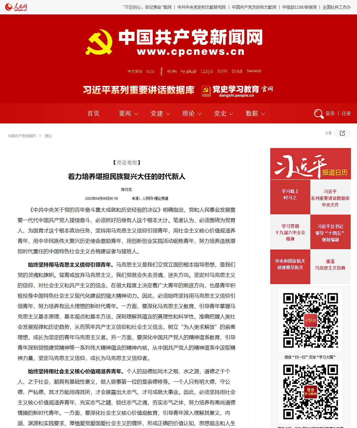 近日,人民网理论频道刊发我校党委书记陈付龙署名文章《着力培养堪担民族复兴大任的时代新人》,特将全文转载如下。