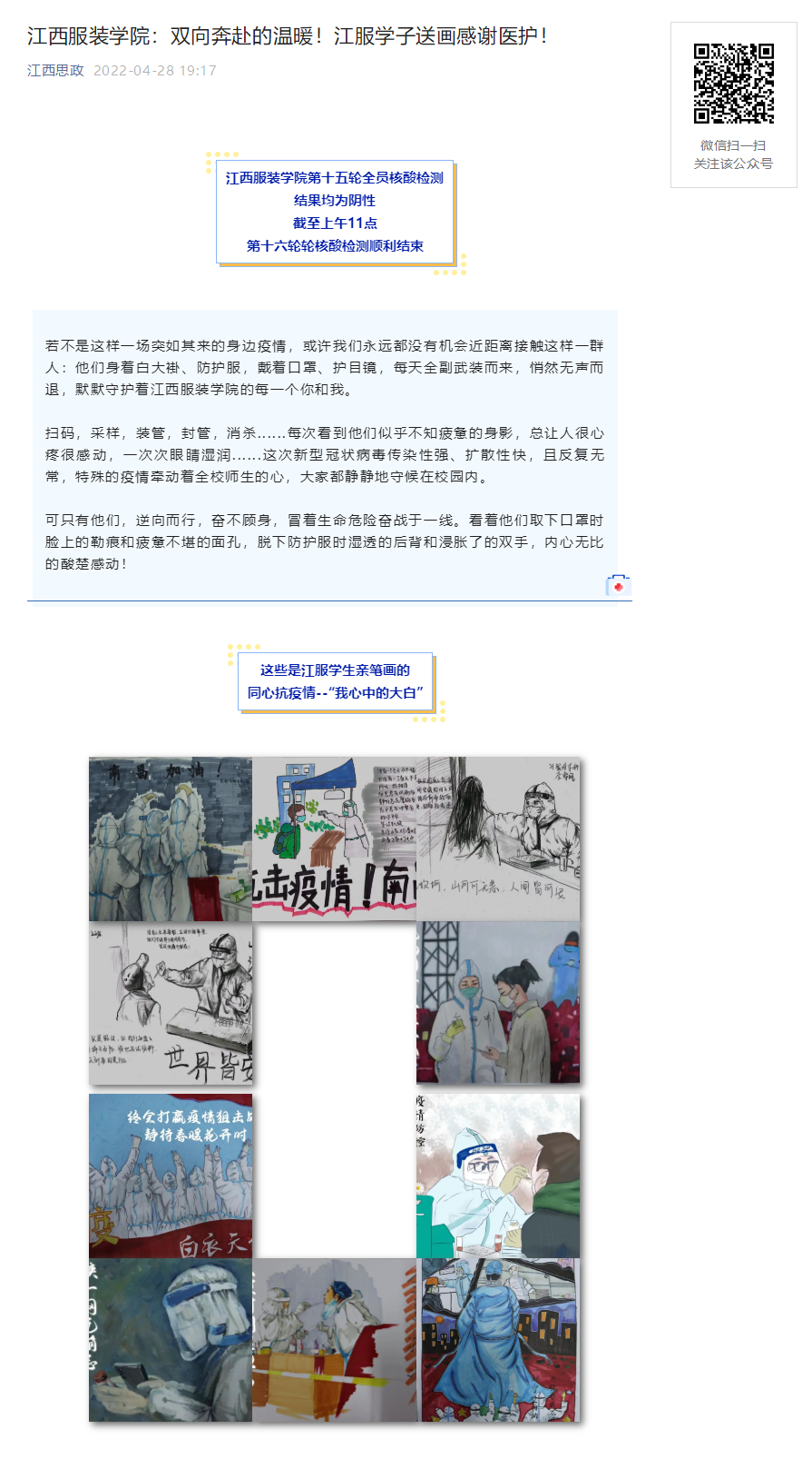 江西服装学院大学生记者团摄影部和采访部的新闻记者们每一次核酸采样都身临一线,他们用文字和手中的相机记录下医护们感人的瞬间,他们把“感悟瞬间”分享给记者团交流群的时候,大家颇受鼓舞,一场由记者团学生发起的爱心送画活动悄悄进行着。“想到第二天要完成伟大的送画使命,大白们可以收到我们的惊喜了,我都睡不着......”,采访部李珊同学非常激动,迫不及待地想要表达大家对医护的敬佩和感激之情。