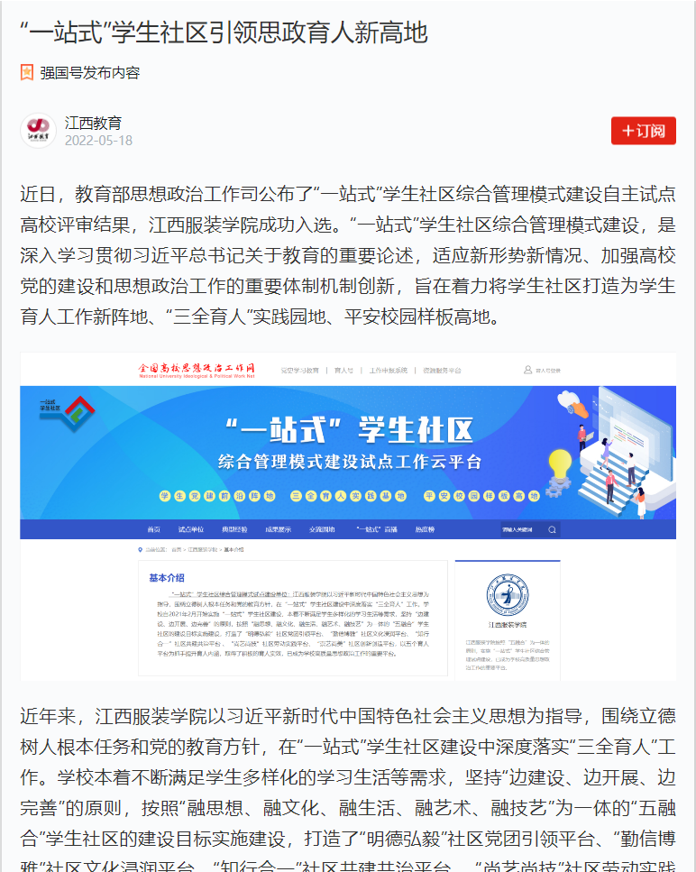 近日,教育部思想政治工作司公布了“一站式”学生社区综合管理模式建设自主试点高校评审结果,江西服装学院成功入选。“一站式”学生社区综合管理模式建设,是深入学习贯彻习近平总书记关于教育的重要论述,适应新形势新情况、加强高校党的建设和思想政治工作的重要体制机制创新,旨在着力将学生社区打造为学生育人工作新阵地、“三全育人”实践园地、平安校园样板高地。