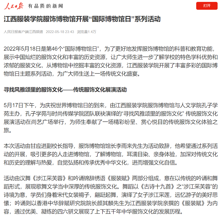 2022年5月18日是第46个“国际博物馆日”,为了更好地发挥服饰博物馆的科普和教育功能,展示中国灿烂的服饰文化和丰富的历史资源,让广大师生进一步了解学校的特色学科优势和浓郁的服装文化,从博物馆中挖掘丰富的文化资源,江西服装学院开展了丰富多彩的国际博物馆日主题系列活动,为广大师生送上一场传统文化盛宴。