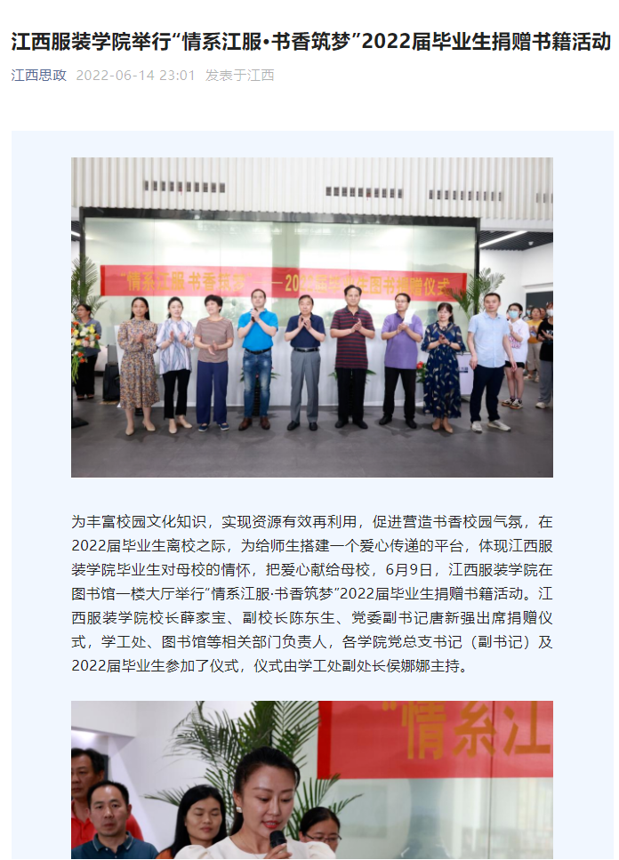 为丰富校园文化知识,实现资源有效再利用,促进营造书香校园气氛,在2022届毕业生离校之际,为给师生搭建一个爱心传递的平台,体现江西服装学院毕业生对母校的情怀,把爱心献给母校,6月9日,江西服装学院在图书馆一楼大厅举行“情系江服·书香筑梦”2022届毕业生捐赠书籍活动。江西服装学院校长薛家宝、副校长陈东生、党委副书记唐新强出席捐赠仪式,学工处、图书馆等相关部门负责人,各学院党总支书记(副书记)及2022届毕业生参加了仪式,仪式由学工处副处长侯娜娜主持。
