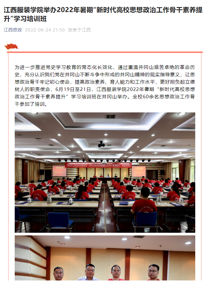 为进一步推进党史学习教育的常态化长效化,通过重温井冈山艰苦卓绝的革命历史,充分认识我们党在井冈山不断斗争中形成的井冈山精神的现实指导意义,让思想政治骨干牢记初心使命,提高政治素养、育人能力和工作水平,更好担负起立德树人的职责使命,6月19日至21日,江西服装学院2022年暑期“新时代高校思想政治工作骨干素养提升”学习培训班在井冈山举办。全校60余名思想政治工作骨干参加了培训。