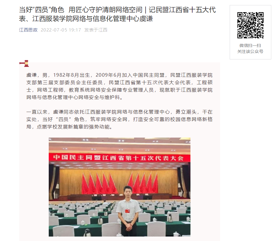一直以来,虞谦同志依托江西服装学院网络与信息化管理中心,勇立潮头,干在实处,当好“四员”角色,筑牢网络安全网,打造安全可靠的校园信息网络新格局,点燃学校发展新篇章的强势动能。