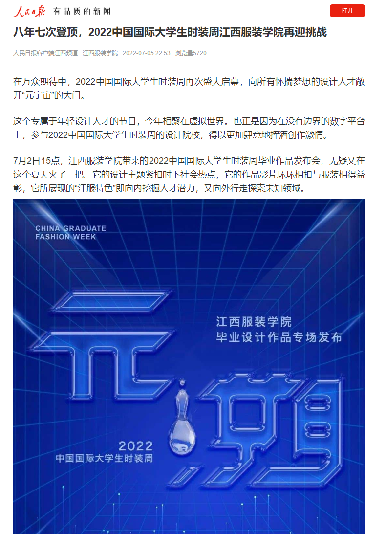 在万众期待中,2022中国国际大学生时装周再次盛大启幕,向所有怀揣梦想的设计人才敞开“元宇宙”的大门。7月2日15点,江西服装学院带来的2022中国国际大学生时装周毕业作品发布会,无疑又在这个夏天火了一把。它的设计主题紧扣时下社会热点,它的作品影片环环相扣与服装相得益彰,它所展现的“江服特色”即向内挖掘人才潜力,又向外行走探索未知领域。