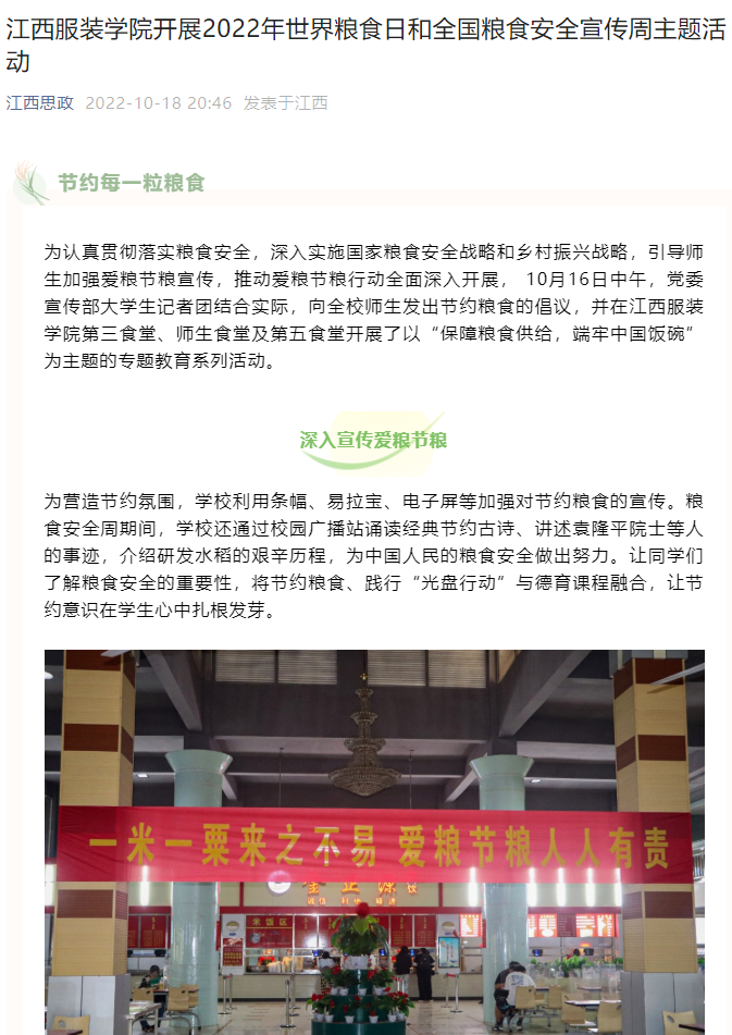 为认真贯彻落实粮食安全,深入实施国家粮食安全战略和乡村振兴战略,引导师生加强爱粮节粮宣传,推动爱粮节粮行动全面深入开展, 10月16日中午,党委宣传部大学生记者团结合实际,向全校师生发出节约粮食的倡议,并在江西服装学院第三食堂、师生食堂及第五食堂开展了以“保障粮食供给,端牢中国饭碗”为主题的专题教育系列活动。