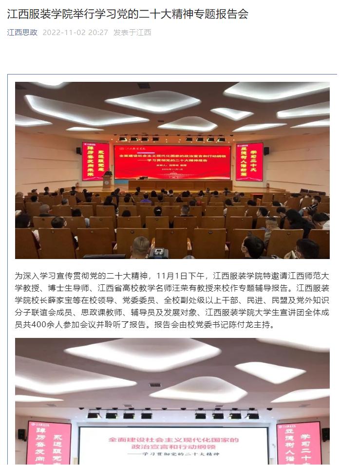 为深入学习宣传贯彻党的二十大精神,11月1日下午,江西服装学院特邀请江西师范大学教授、博士生导师、江西省高校教学名师汪荣有教授来校作专题辅导报告。江西服装学院校长薛家宝等在校领导、党委委员、全校副处级以上干部、民进、民盟及党外知识分子联谊会成员、思政课教师、辅导员及发展对象、江服大学生宣讲团全体成员共400余人参加会议并聆听了报告。报告会由校党委书记陈付龙主持。