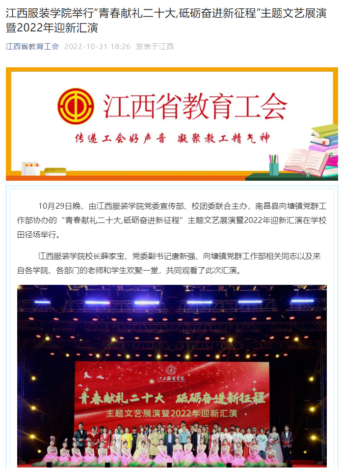 江西省教育工委:江西服装学院举行“青春献礼二十大,砥砺奋进新征程”主题文艺展演暨2022年迎新汇演