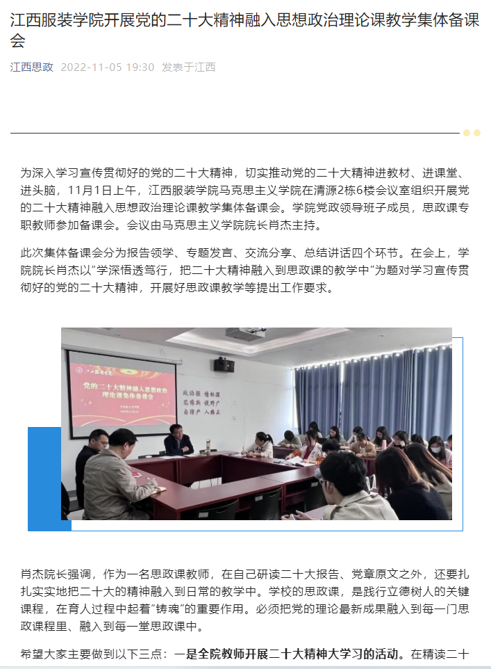 为深入学习宣传贯彻好的党的二十大精神,切实推动党的二十大精神进教材、进课堂、进头脑,11月1日上午,江西服装学院马克思主义学院在清源2栋6楼会议室组织开展党的二十大精神融入思想政治理论课教学集体备课会。学院党政领导班子成员,思政课专职教师参加备课会。会议由马克思主义学院院长肖杰主持。