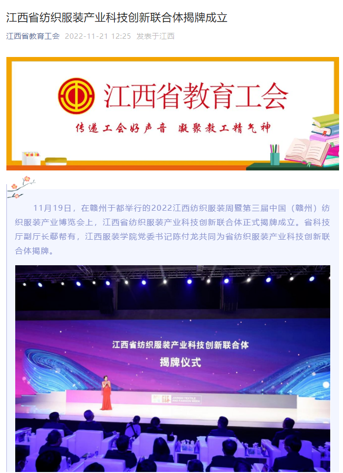11月19日,在赣州于都举行的2022江西纺织服装周暨第三届中国(赣州)纺织服装产业博览会上,江西省纺织服装产业科技创新联合体正式揭牌成立。省科技厅副厅长鄢帮有,江西服装学院党委书记陈付龙共同为省纺织服装产业科技创新联合体揭牌。