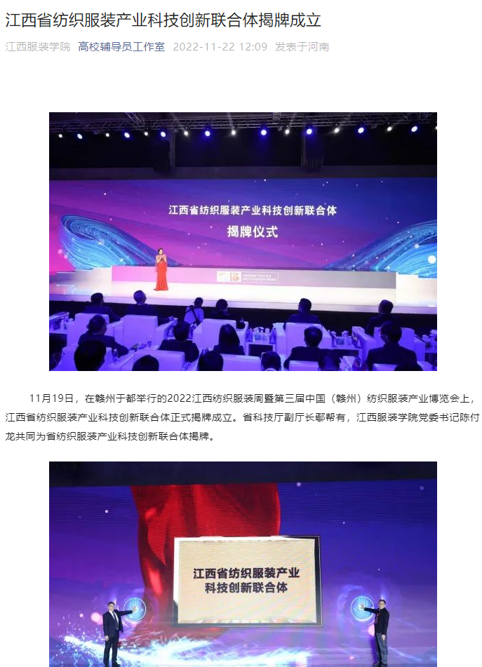 11月19日,在赣州于都举行的2022江西纺织服装周暨第三届中国(赣州)纺织服装产业博览会上,江西省纺织服装产业科技创新联合体正式揭牌成立。省科技厅副厅长鄢帮有,江西服装学院党委书记陈付龙共同为省纺织服装产业科技创新联合体揭牌。
