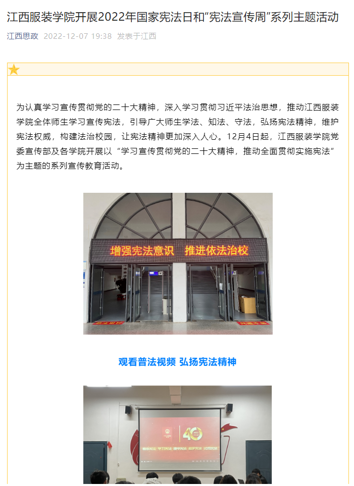 为认真学习宣传贯彻党的二十大精神,深入学习贯彻习近平法治思想,推动我校全体师生学习宣传宪法,引导广大师生学法、知法、守法,弘扬宪法精神,维护宪法权威,构建法治校园,让宪法精神更加深入人心。12月4日起,江西服装学院党委宣传部及各学院开展以“学习宣传贯彻党的二十大精神,推动全面贯彻实施宪法”为主题的系列宣传教育活动。