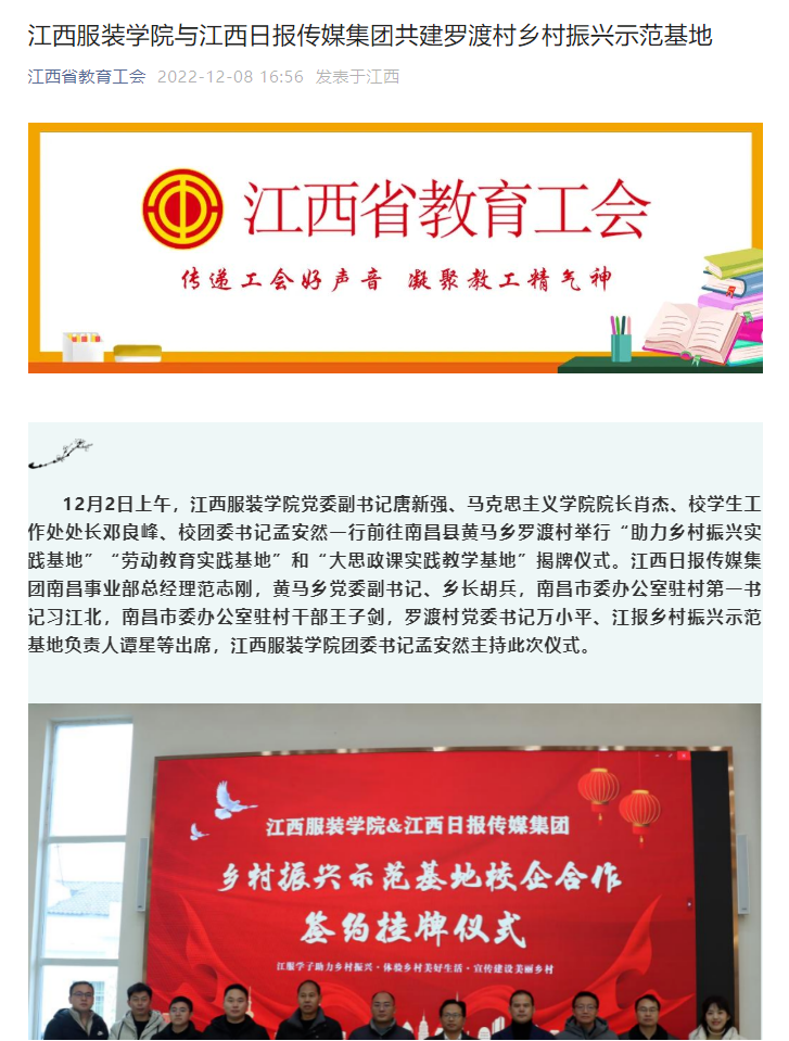 为深入贯彻落实党的二十大精神,2022年12月2日上午,江西服装学院党委副书记唐新强、马克思主义学院院长肖杰、校学生工作处处长邓良峰、校团委书记孟安然一行前往南昌县黄马乡罗渡村举行“助力乡村振兴实践基地”、“劳动教育实践基地”和“大思政课实践教学基地”揭牌仪式。江西日报传媒集团南昌事业部总经理范志刚,黄马乡党委副书记、乡长胡兵,南昌市委办公室驻村第一书记习江北,南昌市委办公室驻村干部王子剑,罗渡村党委书记万小平、江报乡村振兴示范基地负责人谭星等出席,江西服装学院团委书记孟安然主持此次仪式。