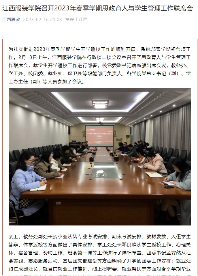 为扎实推进2023年春季学期学生开学返校工作的顺利开展,系统部署学期初各项工作。2月13日上午,江西服装学院在行政楼二楼会议室召开了思政育人与学生管理工作联席会,就学生开学返校工作进行部署。校党委副书记唐新强出席会议,教务处、学工处、校团委、就业处、保卫处等职能部门负责人,各学院党总支书记(副)、学工办主任(副)等人员参加了会议。