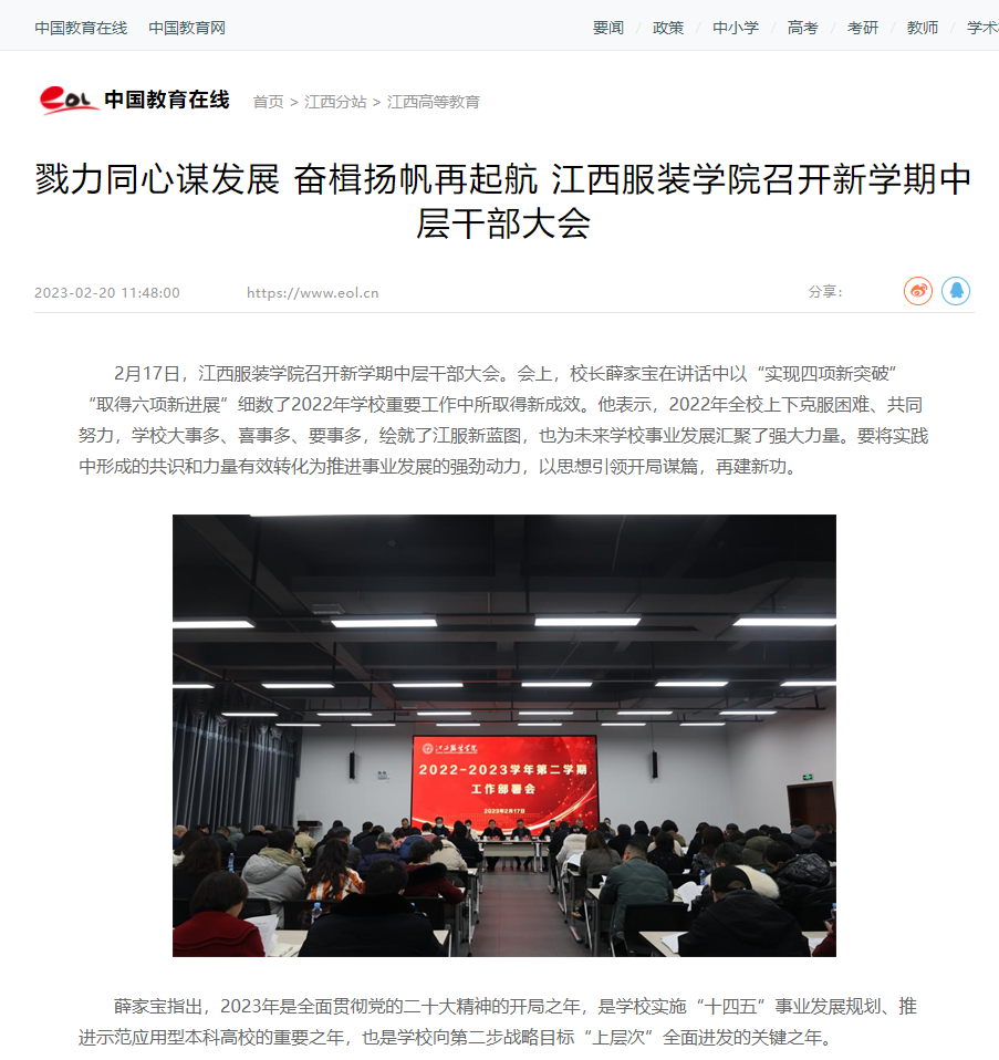 2月17日,江西服装学院召开新学期中层干部大会。会上,校长薛家宝在讲话中以“实现四项新突破”“取得六项新进展”细数了2022年学校重要工作中所取得新成效。他表示,2022年全校上下克服困难、共同努力,学校大事多、喜事多、要事多,绘就了江服新蓝图,也为未来学校事业发展汇聚了强大力量。要将实践中形成的共识和力量有效转化为推进事业发展的强劲动力,以思想引领开局谋篇,再建新功。