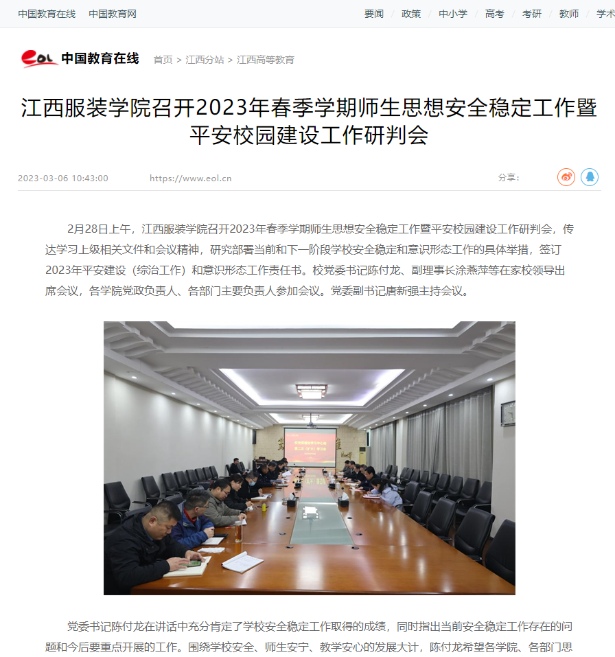 2月28日上午,江西服装学院召开2023年春季学期师生思想安全稳定工作暨平安校园建设工作研判会,传达学习上级相关文件和会议精神,研究部署当前和下一阶段学校安全稳定和意识形态工作的具体举措,签订2023年平安建设(综治工作)和意识形态工作责任书。校党委书记陈付龙、副理事长涂燕萍等在家校领导出席会议,各学院党政负责人、各部门主要负责人参加会议。党委副书记唐新强主持会议。