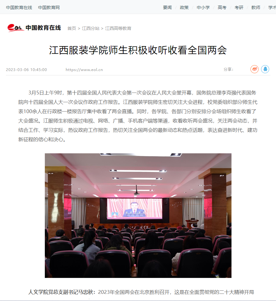 3月5日上午9时,第十四届全国人民代表大会第一次会议在人民大会堂开幕,国务院总理李克强代表国务院向十四届全国人大一次会议作政府工作报告。江西服装学院师生密切关注大会进程,校党委组织部分师生代表100余人在行政楼一楼报告厅集中收看了两会直播。同时,各学院、各部门分别安排分会场组织师生收看了大会盛况。江服师生积极通过电视、网络、广播、手机客户端等渠道,收看收听两会盛况,关注两会动态,并结合工作、学习实际,热议政府工作报告,热切关注全国两会的最新动态和热点话题,表达奋进新时代、建功新征程的信心和决心。