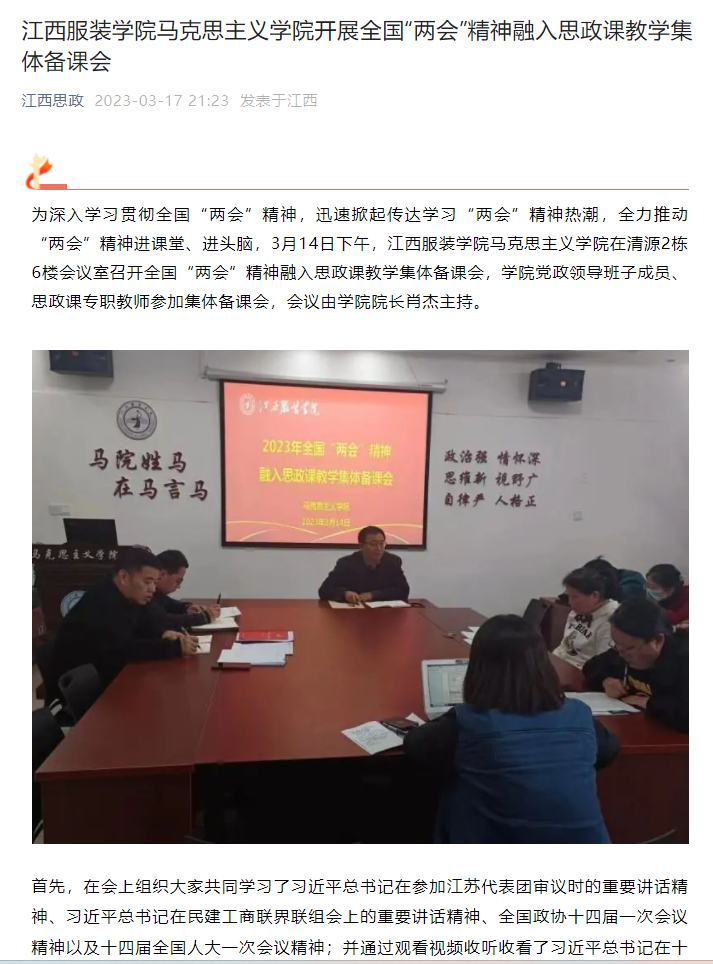 为深入学习贯彻全国“两会”精神,迅速掀起传达学习“两会”精神热潮,全力推动“两会”精神进课堂、进头脑,3月14日下午,江西服装学院马克思主义学院在清源2栋6楼会议室召开全国“两会”精神融入思政课教学集体备课会,学院党政领导班子成员、思政课专职教师参加集体备课会,会议由学院院长肖杰主持。