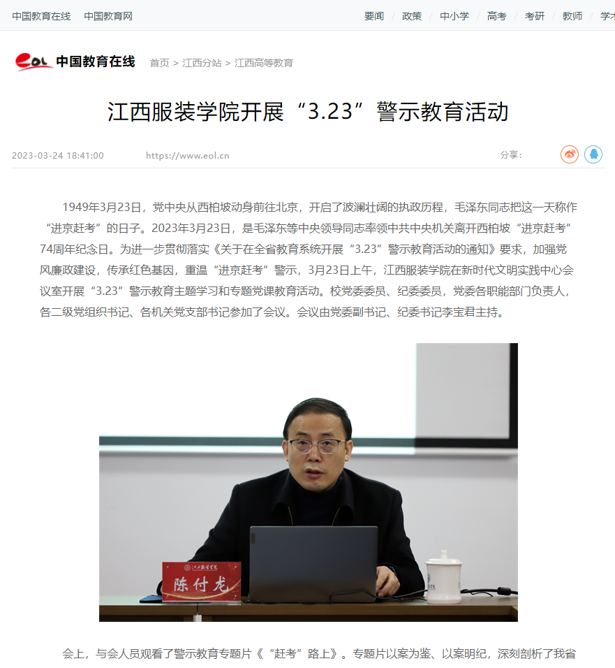 1949年3月23日,党中央从西柏坡动身前往北平,开启了波澜壮阔的执政历程,毛泽东同志把这一天称作“进京赶考”的日子。2023年3月23日,是毛泽东等中央领导同志率领中共中央机关离开西柏坡“进京赶考”74周年纪念日。为进一步贯彻落实《关于在全省教育系统开展“3·23”警示教育活动的通知》要求,加强党风廉政建设,传承红色基因,重温“进京赶考”警示,3月23日上午,江西服装学院在新时代文明实践中心会议室开展“3·23”警示教育主题学习和专题党课教育活动。校党委委员、纪委委员,党委各职能部门负责人,各二级党组织书记、各机关党支部书记参加了会议。会议由党委副书记、纪委书记李宝君主持。