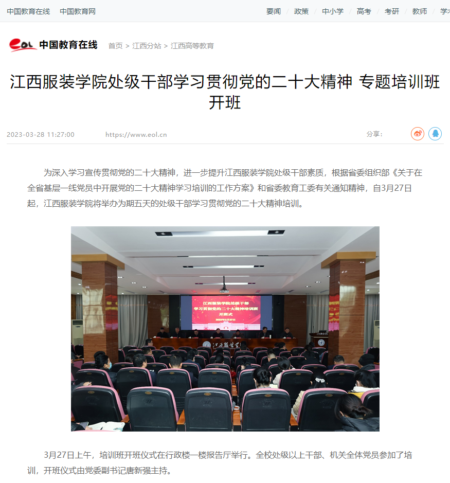 为深入学习宣传贯彻党的二十大精神,进一步提升江西服装学院处级干部素质,根据省委组织部《关于在全省基层一线党员中开展党的二十大精神学习培训的工作方案》和省委教育工委有关通知精神,自3月27日起,江西服装学院将举办为期五天的处级干部学习贯彻党的二十大精神培训。3月27日上午,培训班开班仪式在行政楼一楼报告厅举行。全校处级以上干部、机关全体党员参加了培训,开班仪式由党委副书记唐新强主持。